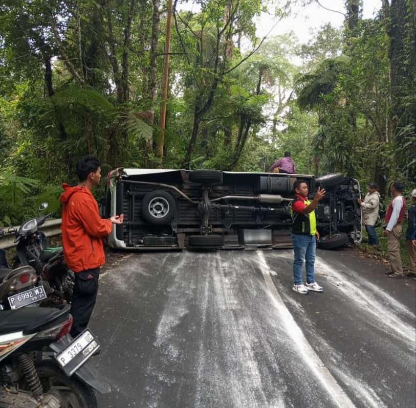 Sebuah minibus Isuzu Elf pengangkut wisatawan asal Tiongkok terguling di jalur arah Taman Wisata Alam (TWA) Kawah Ijen, Licin, Banyuwangi