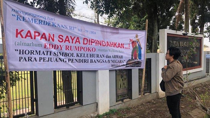 Banner tersebut bertuliskan ‘Menyongsong Hari Kemerdekaan Republik Indonesia ke 79. Kapan Saya Dipindahkan!!(Alm Edy Rumpoko Mantan Wali Kota Batu). Hormatilah Simbol Keluhuran dan Arwah Para Pejuang Pendiri Bangsa dan Negara’.
