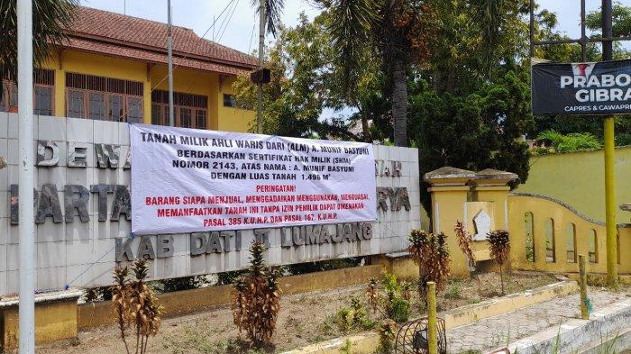 TRIBUNJATIMTIMUR.COM, Lumajang - Ahli waris A Munif Basyuni memasang spanduk berisi peringatan kepemilikan lahan di Kantor DPC Partai Golkar, Rabu (18/9/2024).
